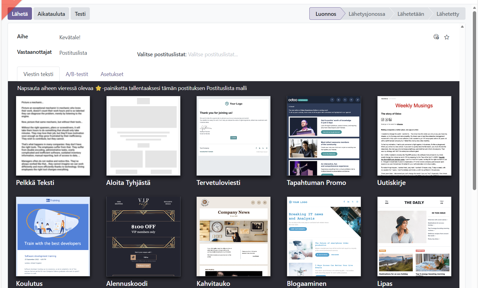 Valitse lähetettävälle sähköpostille valmis pohja ja muokkaa mielesi mukaan tai aloita puhtaalta pöydältä ja raahaa haluamiasi elementtejä pohjalle.