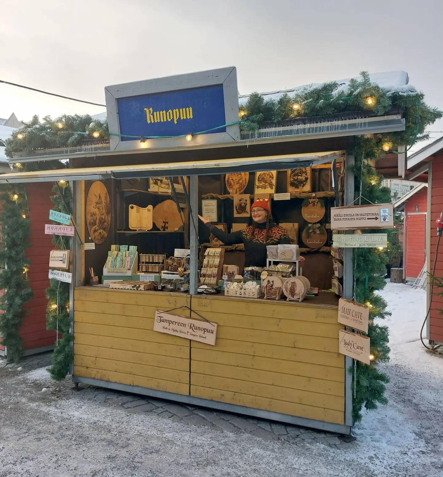 Ja ne ihmiset: he pysähtyivät ihailemaan tuotteita ja naureskelemaan hilpeille kylteille. Kukaan ei painanut punaista nappia antaakseen palautetta - kaikilla oli jotakin mukavaa sanottavaa. Erilaiset Mummola-kyltit kirvoittivat kertomaan tarinoita omista mummoloista ja kuulin jos jonkinlaisia joulu- ja muita muisteloita. Minulle näytettiin valokuvia kunniapaikasta, johon ostettu taulu tulee ja kuulin ihmisten harrastuksista ja lapsenlapsista.