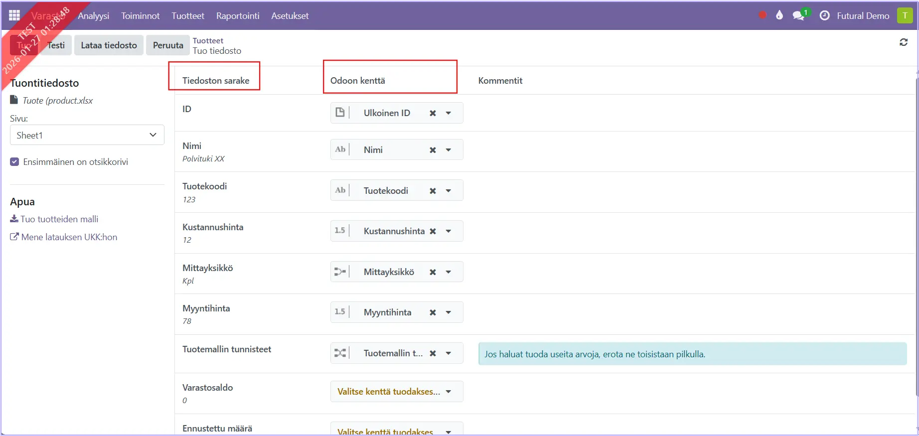 Voit valita sarakkeille kentät, joihin tieto syötetään. Yleensä exportoidun tiedoston kohdalla, Odoo tunnistaa kentät Import-vaiheessa oikein, mutta ne kannattaa kuitenkin tarkistaa.