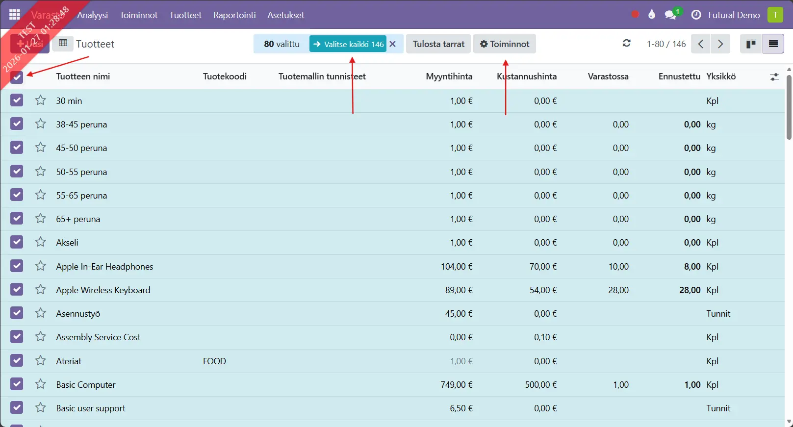 Futural ERP mahdollistaa monien tietojen lataamisen sisään ja ulos excel- tai csv-tiedostoina. Toiminto helpottaa esimerkiksi tuotteiden luomista tai tuotetietojen päivittämistä.