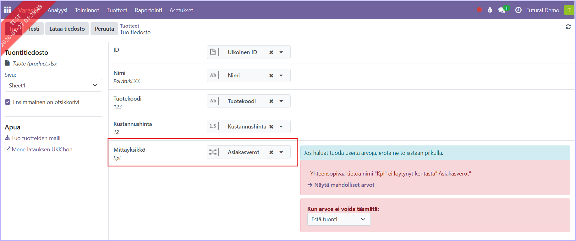 Tietojen tuontia kannattaa aina testata ensin vain yhdellä tuotteella tai testiasennuksessa, jolloin virheiltä vältytään ja/tai niiden korjaaminen on helpompaa.