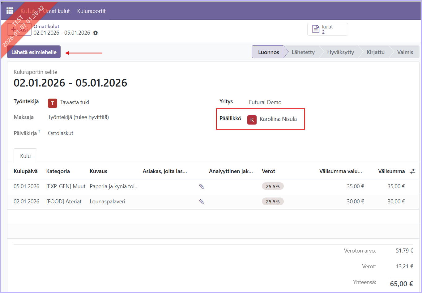 Hae kulut hyväksyvä työntekijä/esihenkilö kohtaan Päällikkö ja lähetä kuluraportti hyväksyttäväksi. Raportin tila muuttuu kohtaan Lähetetty.
