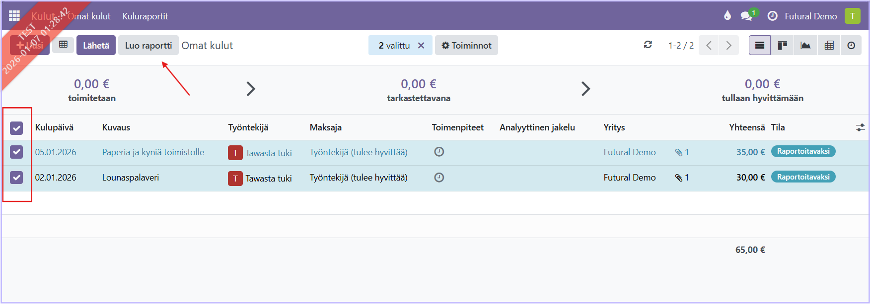 Jos haluat samalle kuluraportille useamman kulun, luo kaikille kuluille ensin oma rivi. Tämän jälkeen mene päänäkymään, valitse luodut rivit ja paina Luo raportti -nappia.