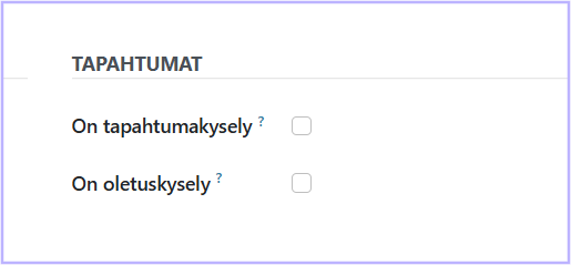 Jos kyselyn halutaan olevan osa tapahtumakyselyitä koskien esim. ilmoittautumista ja tapahtumista lähetettävää palautelomaketta, valitse kyselyn Vaihtoehdot-välilehdeltä aktiiviseksi kohta On tapahtumakysely.