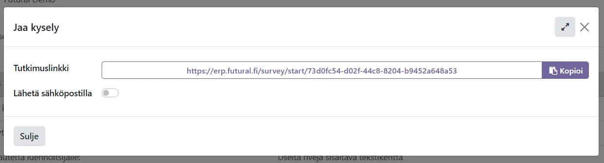 Valitse kyselyn etusivulta Jaa. Voit kopioida kyselyn linkin tai lähettää kyselyn sähköpostilla.