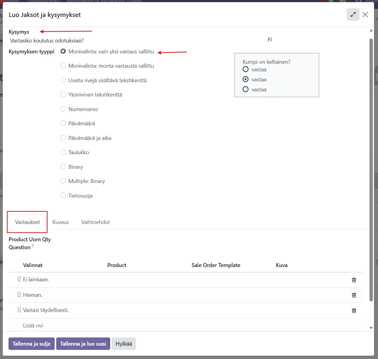 Kirjoita kysymys ja valitse kysymyksen tyyppi. Valikoimassa on monentyyppisiä vaihtoehtoja ja valinnan perusteella niille määritellään erilaisia oletusarvoja. Jos valitaan monivalinta, kirjoita vastausvaihtoehdot Vastaukset-välilehdelle. Tallenna kysymys ja jatka suoraan seuraavan kysymyksen luomiseen tai sulje ikkuna.