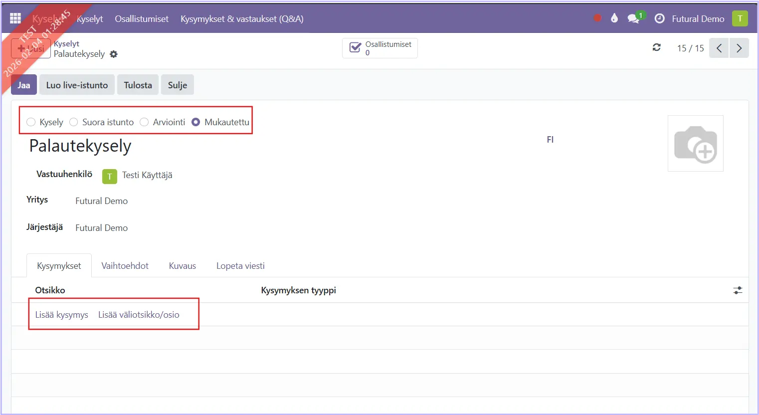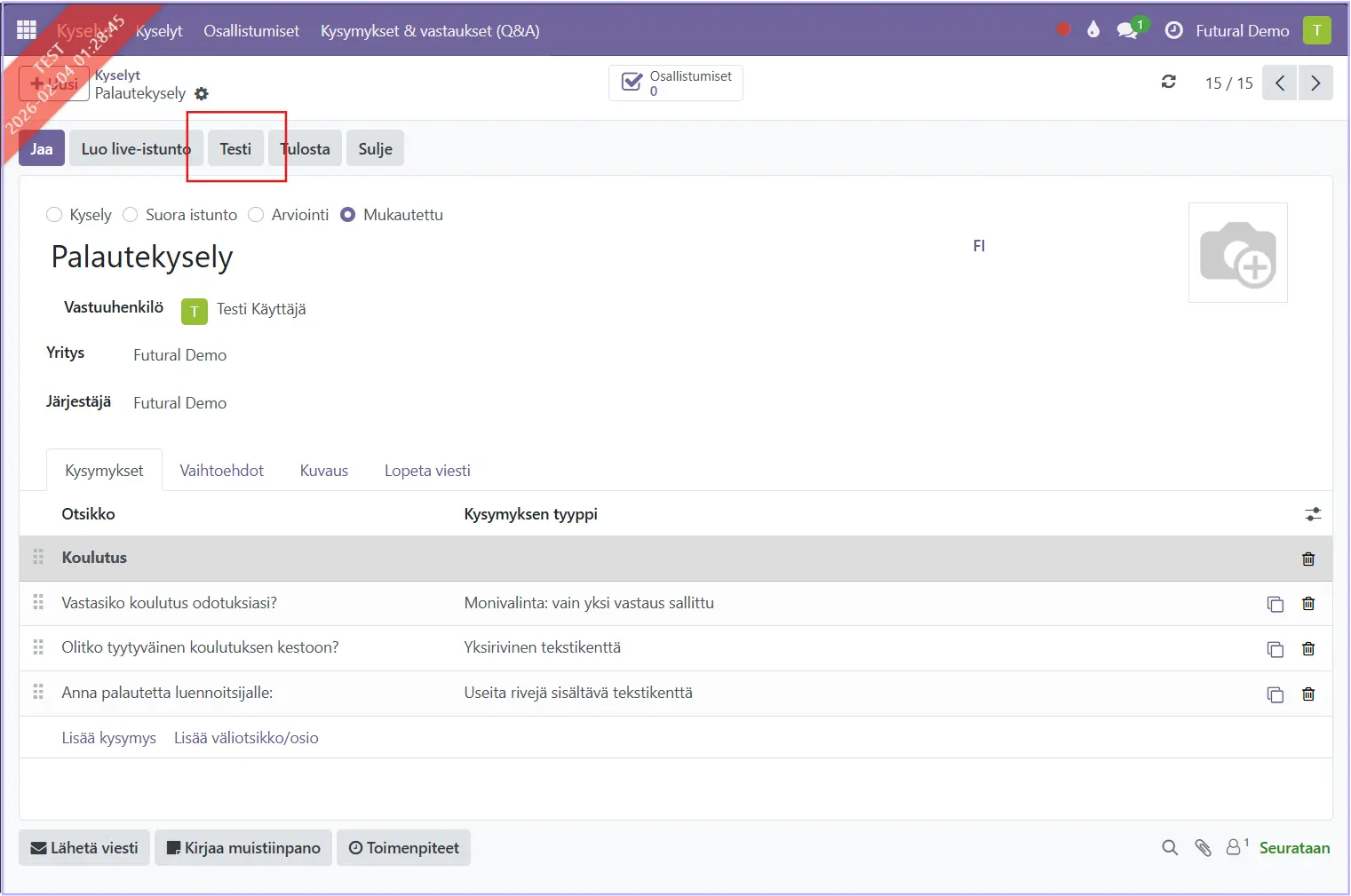 Voit esikatsella kyselyä yläosan napilla Testi.