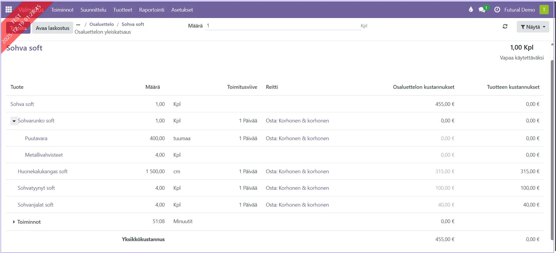 Kun sohvasta tehdään valmistustilaus, syntyy valmistustilaus automaattisesti myös sohvarungolle, jos sen taakse on reitiksi merkitty Valmista/Make to order.