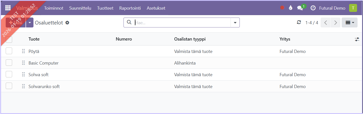 Jo luodut osaluettelot löydät polusta Valmistus - Tuotteet - Osaluettelot: