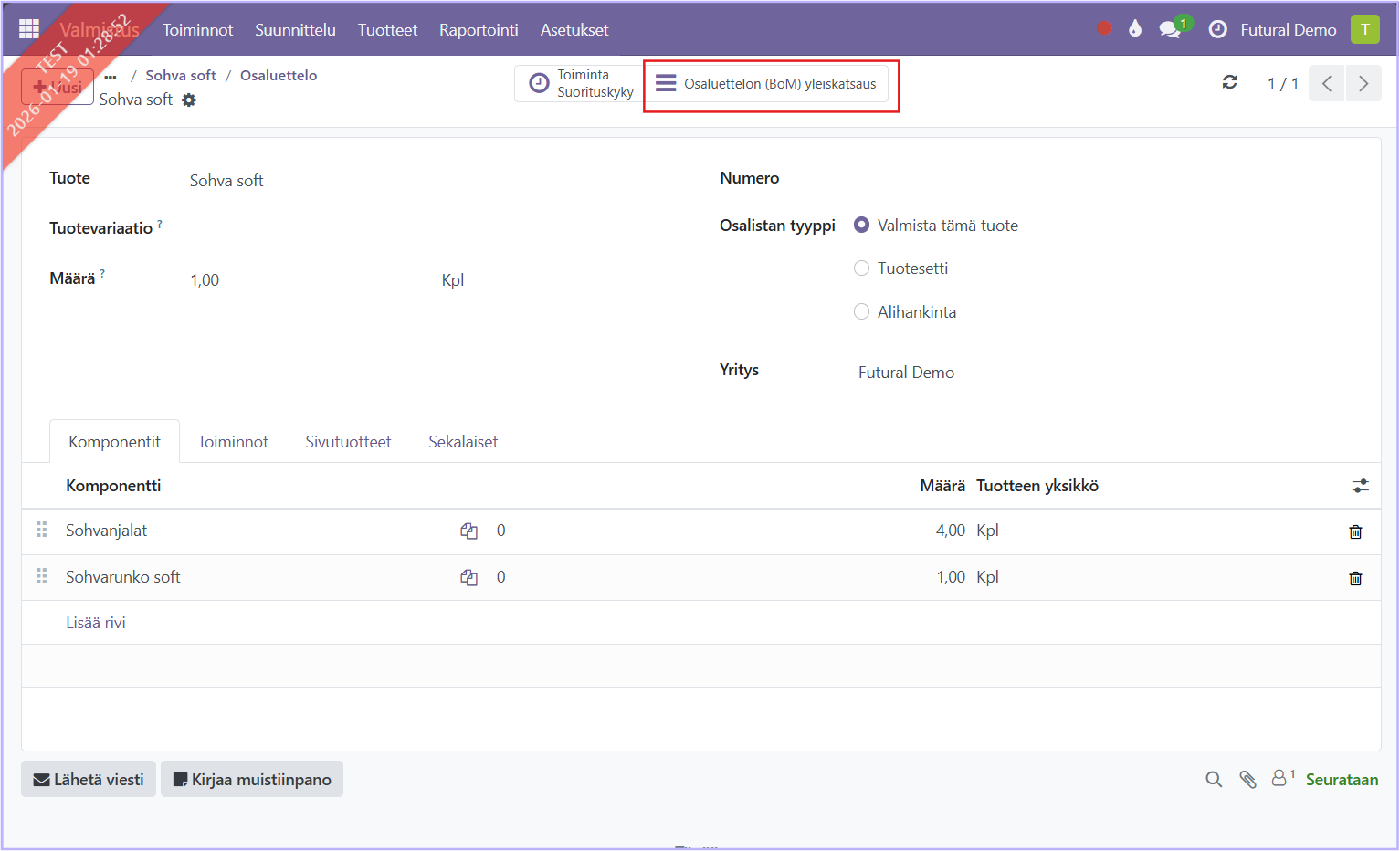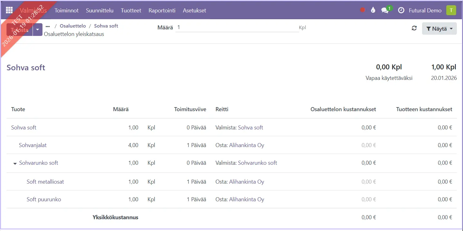 Näet Sohva softille luodun osaluettelon sisällön. Klikkaa auki Alempi tuotantotilaus.