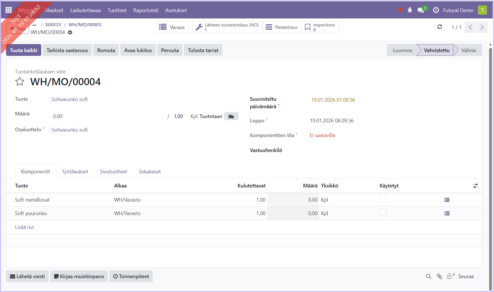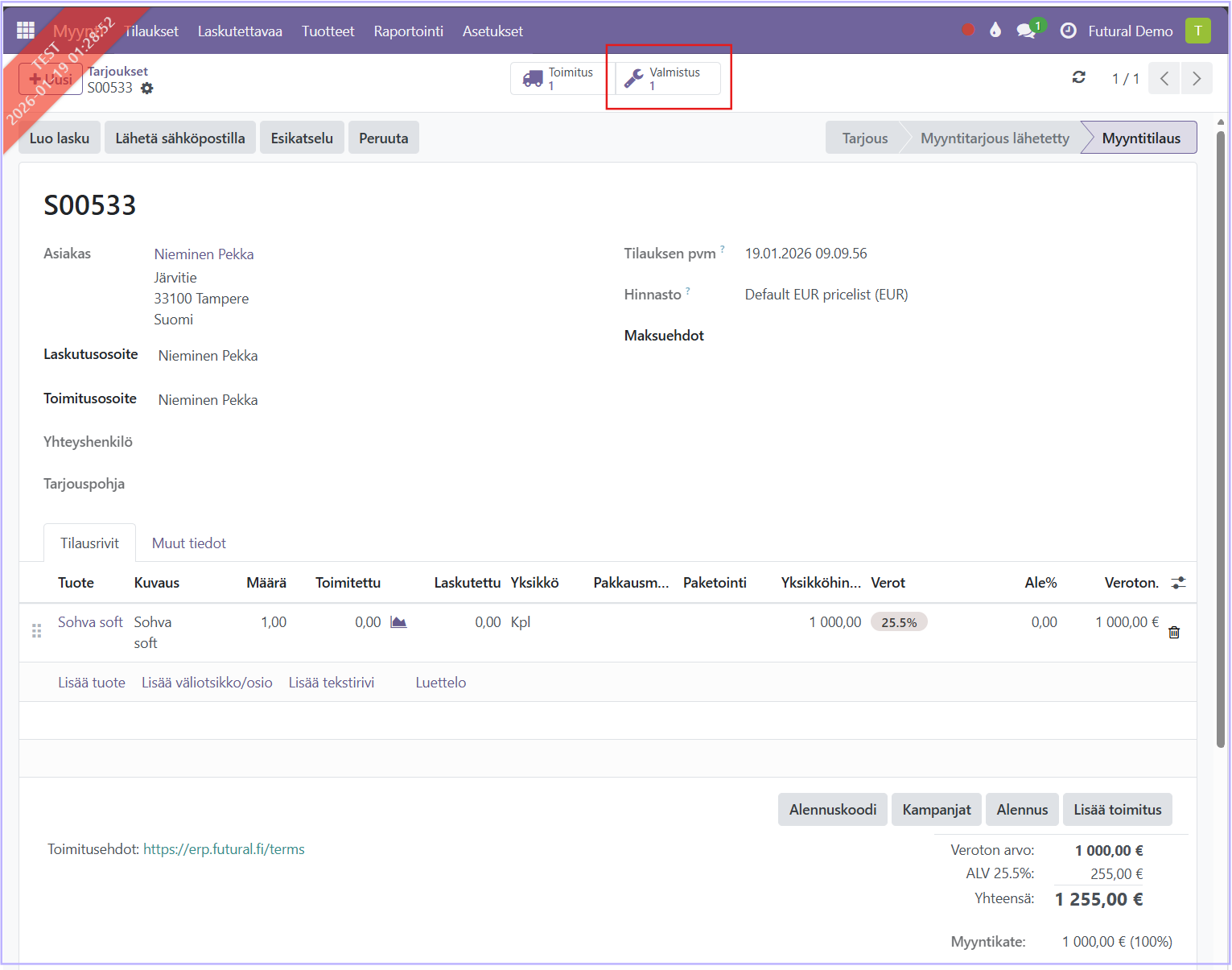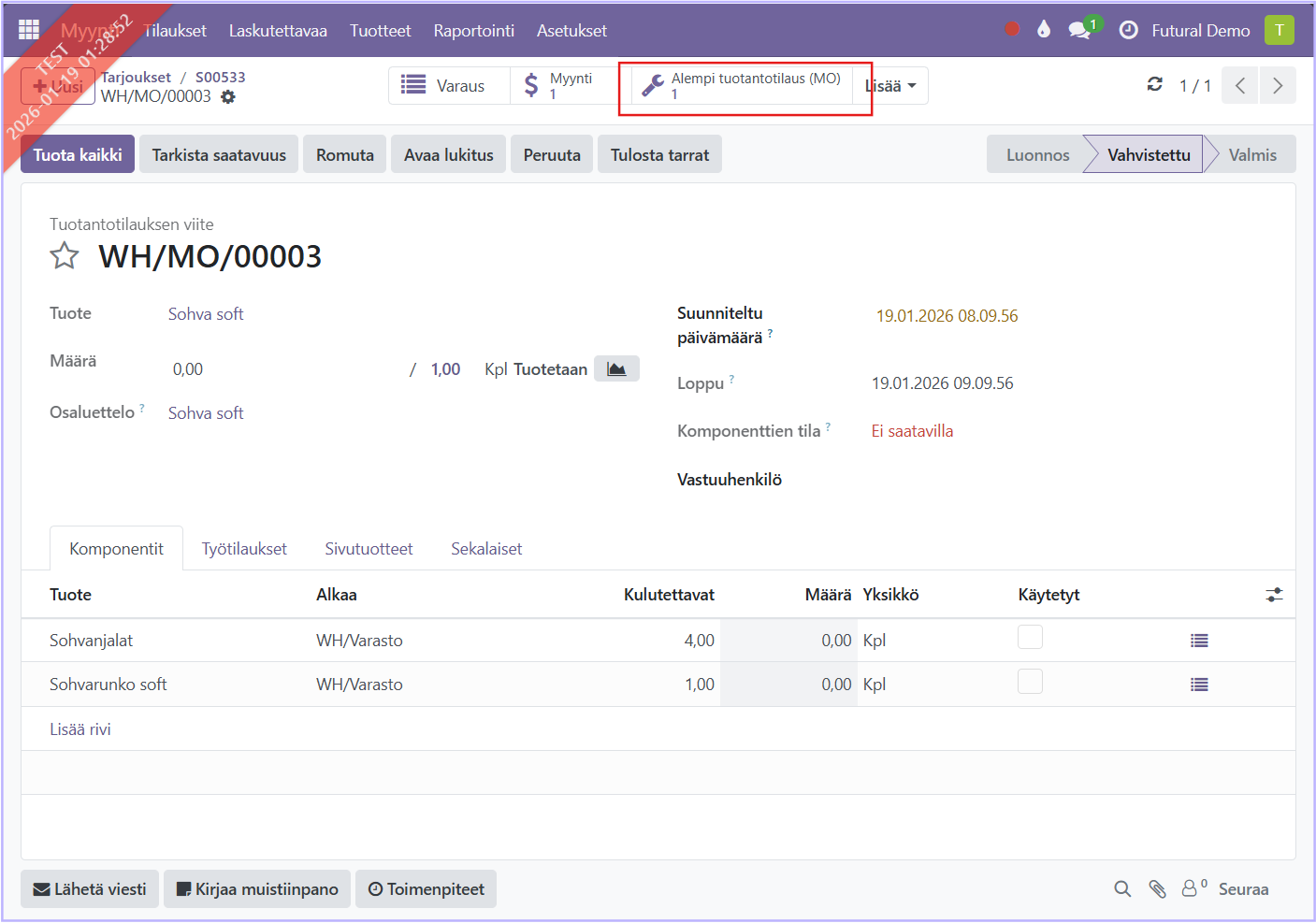 Kun myyntitarjous tuotteelle Sohva Soft varmistetaan myyntitilaukseksi, luo järjestelmä automaattisesti sille valmistustilauksen. Avaa tilaus painamalla valmistus-kuvaketta.