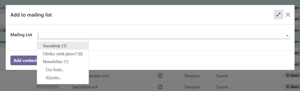 Paina Add contacts to mailing list, jolloin kontaktit lisätään valitsemallesi postituslistalle.