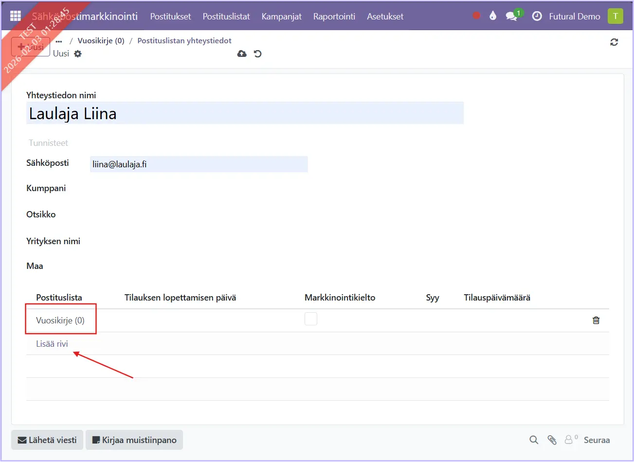 Näkymässä voit lisätä kontaktin useisiin postituslistoihin. Lisää haluamasi postituslista(t) painamalla Lisää rivi. Voit lisätä tilaukselle myös automaattisen päättymispäivän. Tallenna pilvi-symbolista ja yhteystieto lisätään postituslistalle.