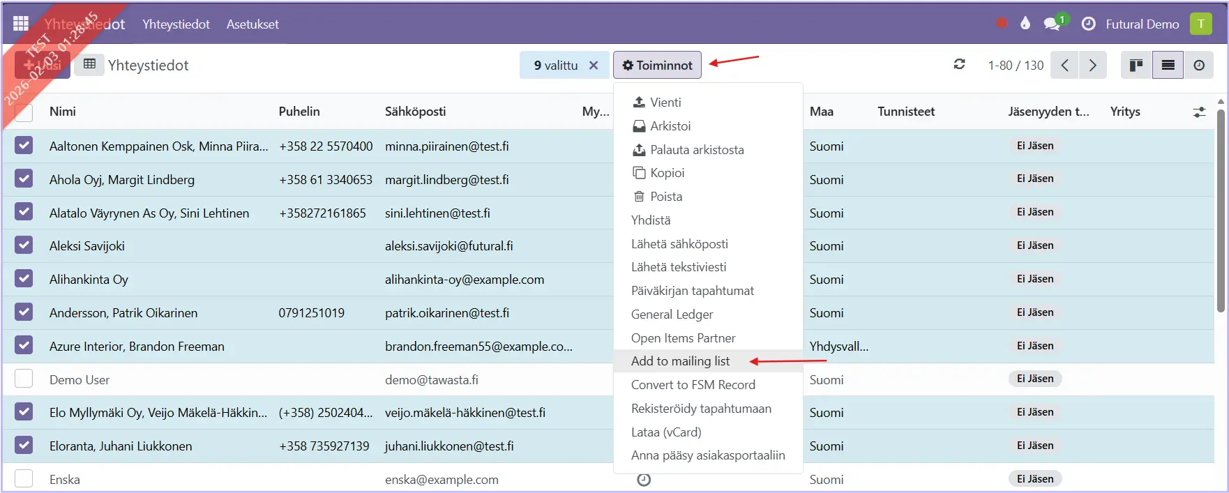 Valitse Toiminnot ja sen alta Add to mailing list.