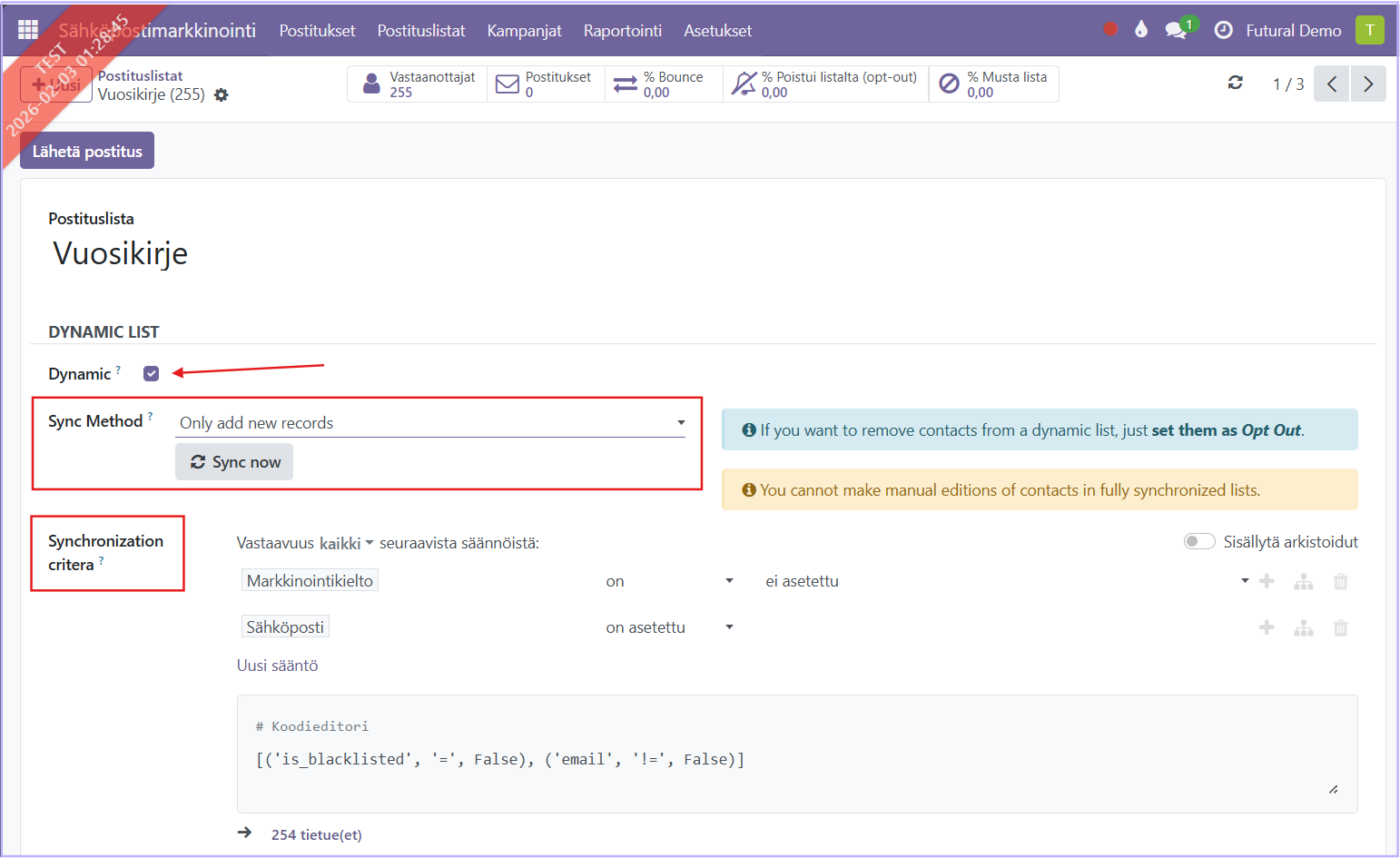 Paina nappia "Sync now", jolloin saat postituslistalle ehdot täyttävät kontaktit. Ehtolistan alapuolella näkyy, montako tietuetta kyseisellä suodatuksella tulisi postituslistaan.