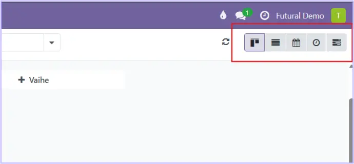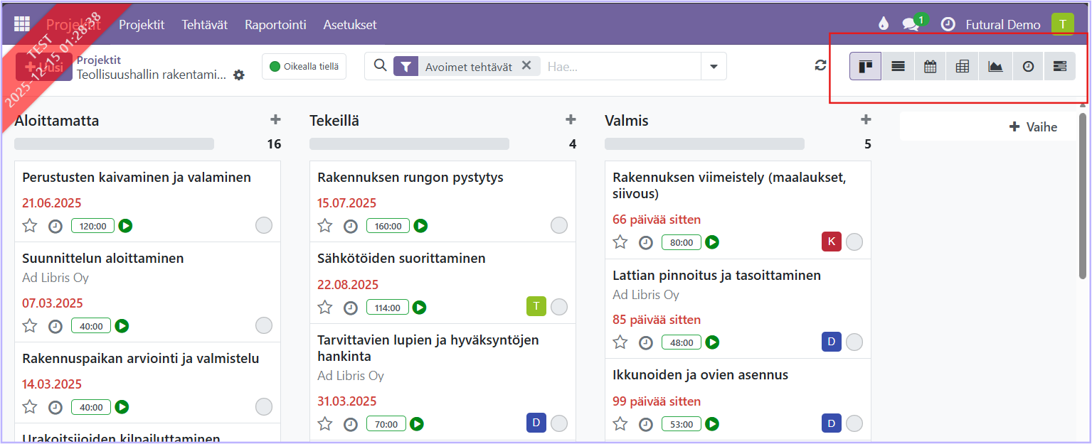 Sekä projekteja että tehtäviä voidaan tarkastella erilaisista näkymistä. Perusnäkymiä voit vaihtaa yläkulman näkymäpainikkeista.