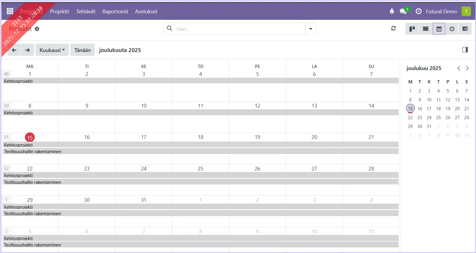 Kalenterinäkymässä projektitehtävät näkyvät sen päivän kohdalla, mikä on merkitty tehtävän määräajaksi.