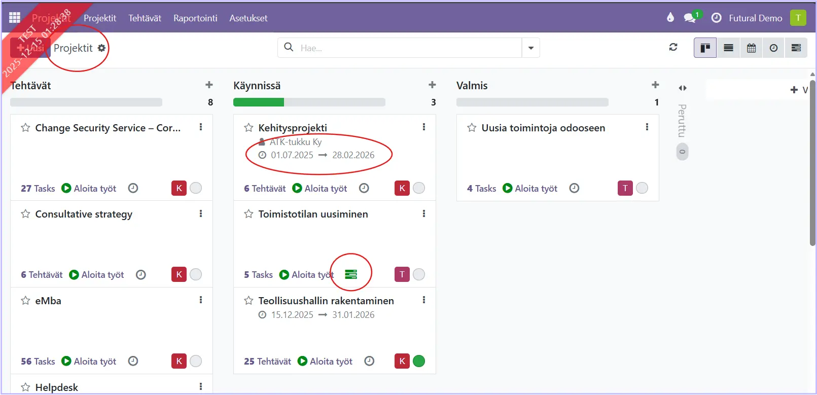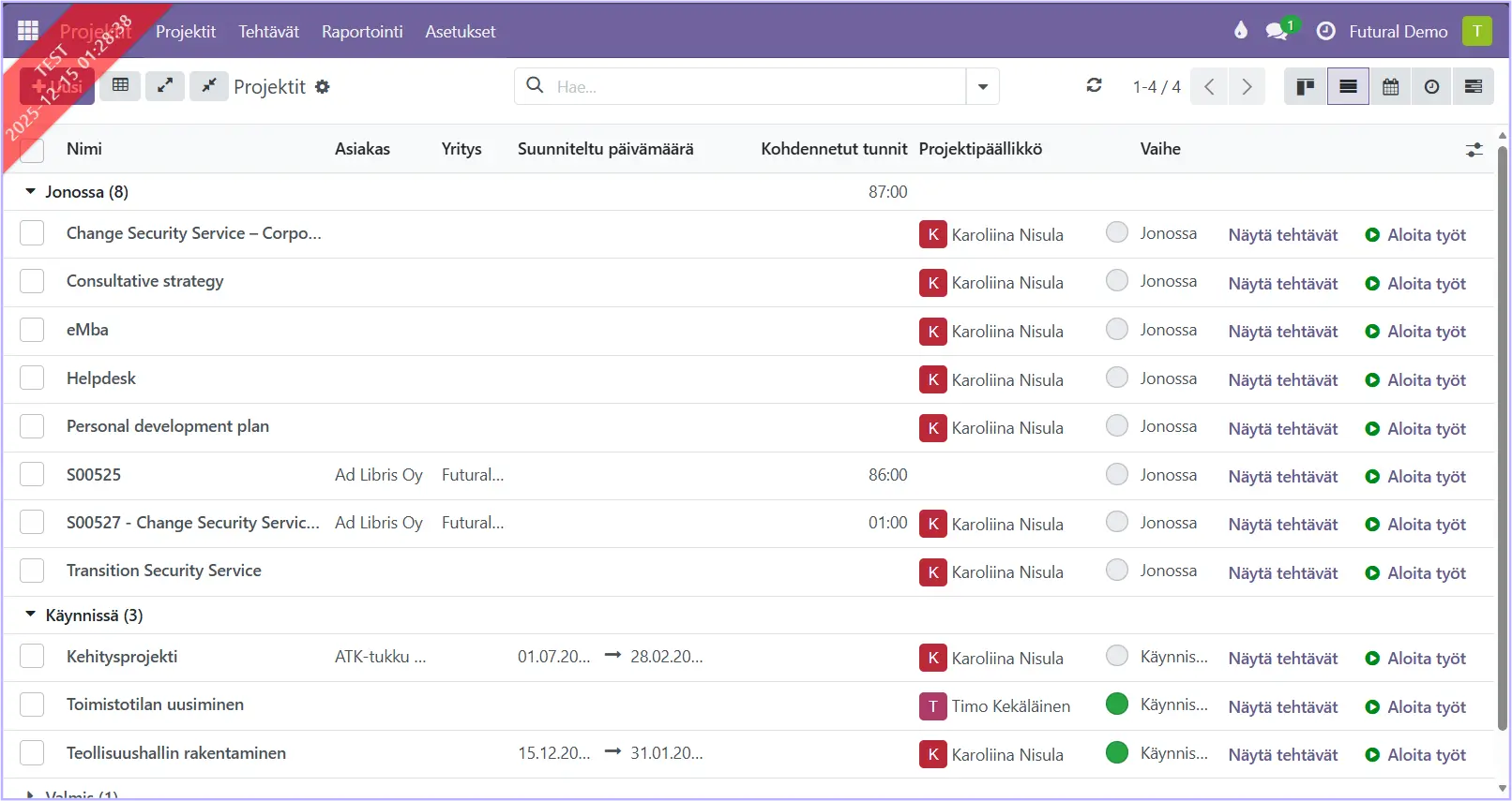 Projektien aikataulun ja tehtävien hallinta löytyy kohdasta Projektit.