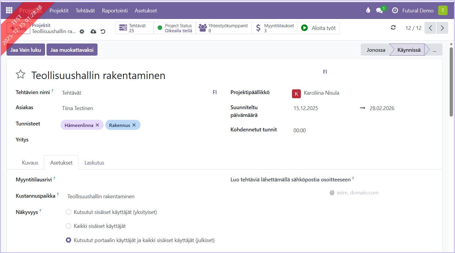 Voit muokata projektin perustietoja kolmen pisteen takaa kohdasta Asetukset.