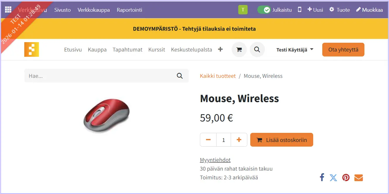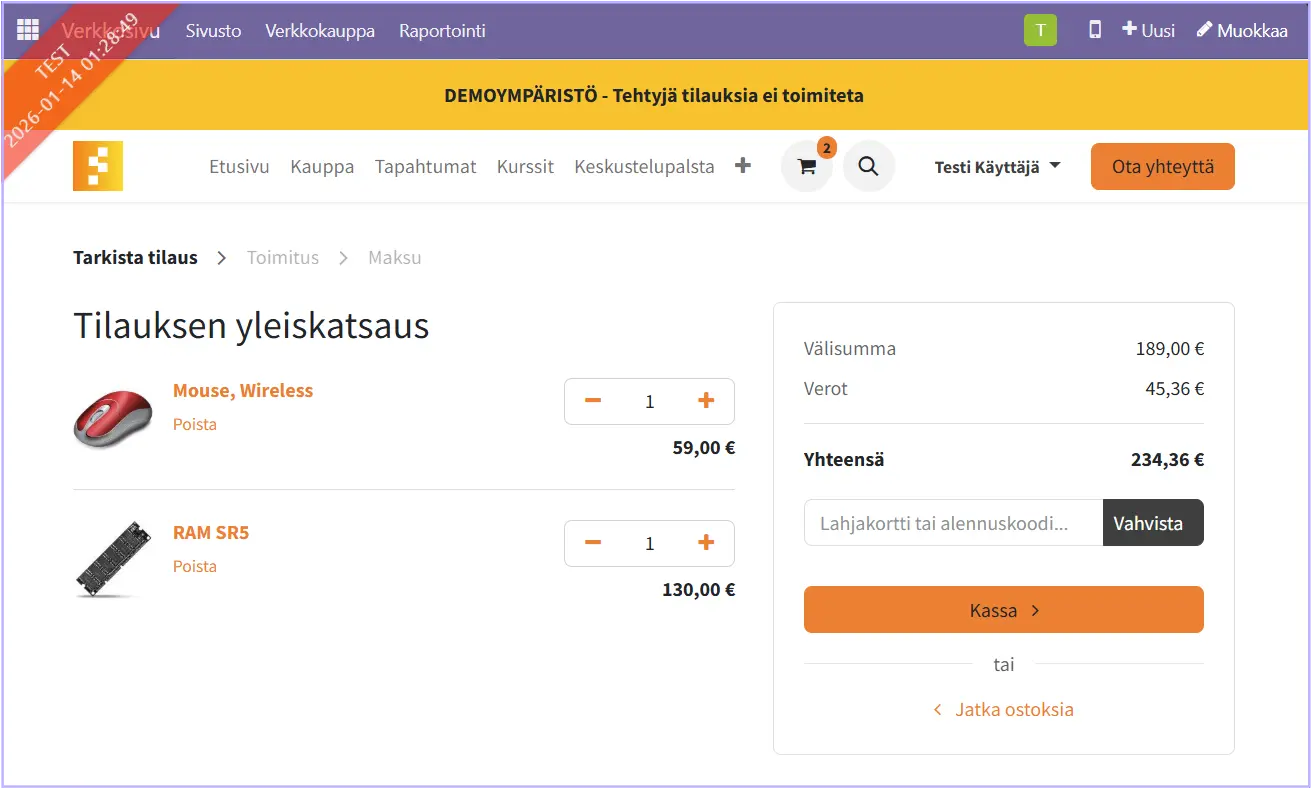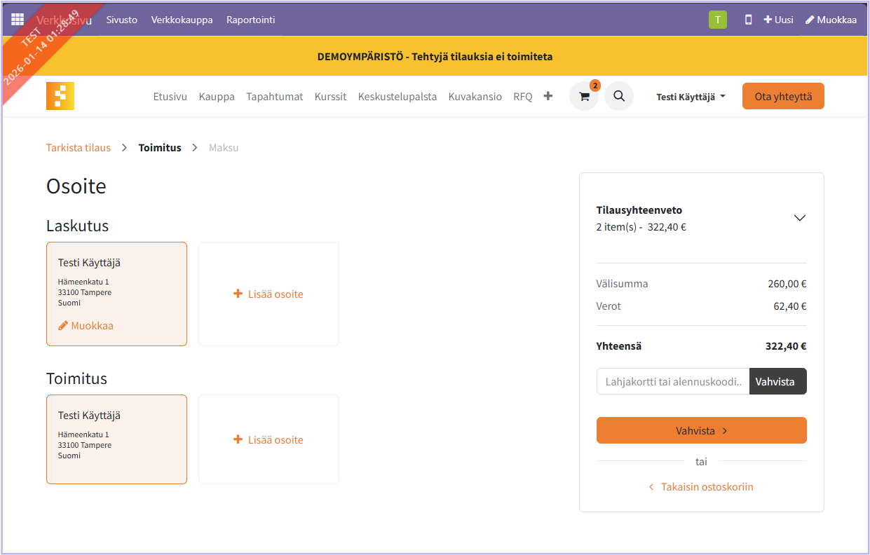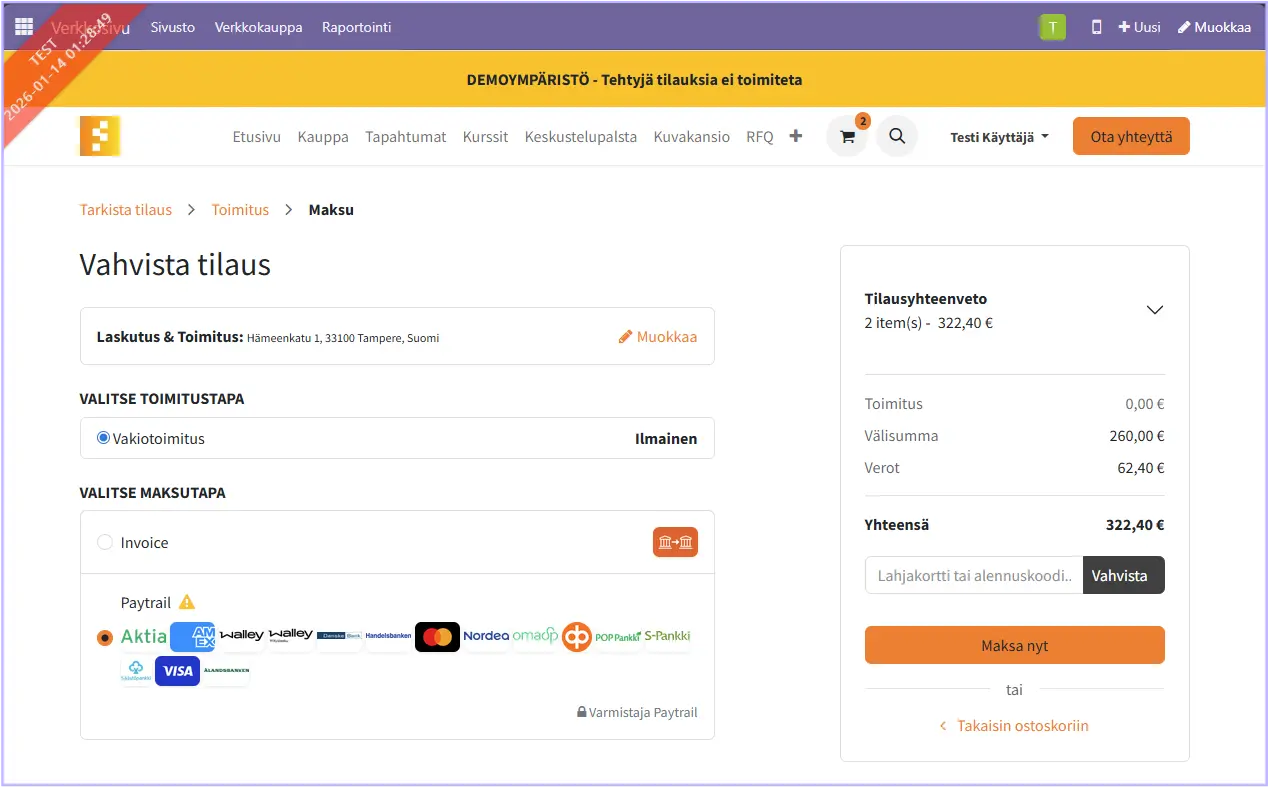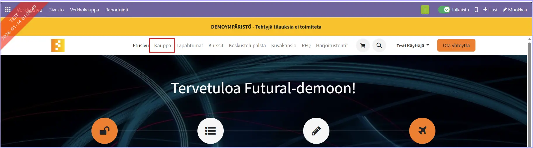Huom! Testijärjestemästä ei lähde tilauksia, eikä siellä voi maksaa niitä. Kaikki järjestelmässä tehdyt tilaukset siirtyvät tarjouksiksi järjestelmän backend-puolelle.