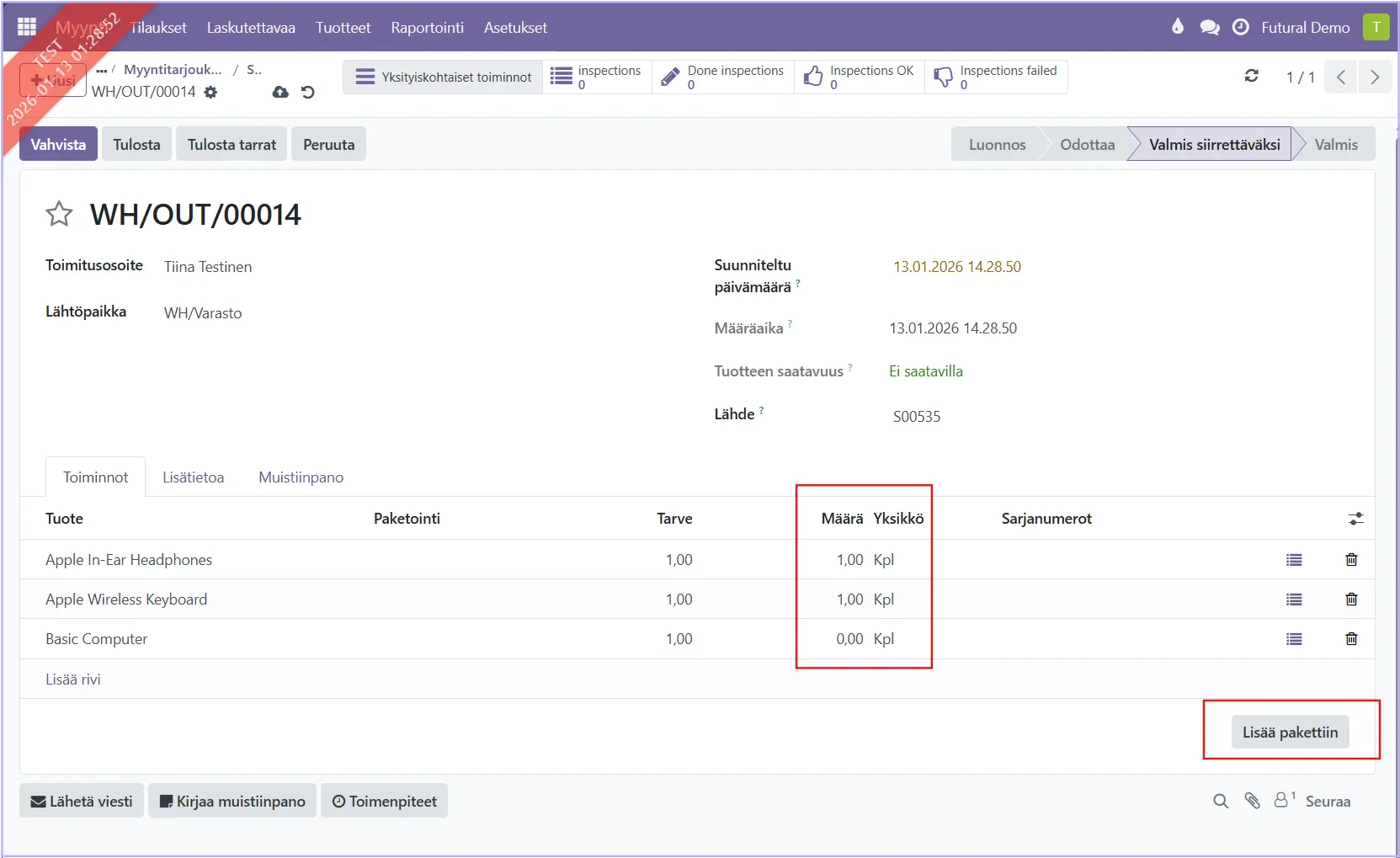 Merkitse ensimmäiseen pakkaukseen laitettavien tuotteiden kpl-määrä kyseiselle riville sarakkeeseen Määrä.