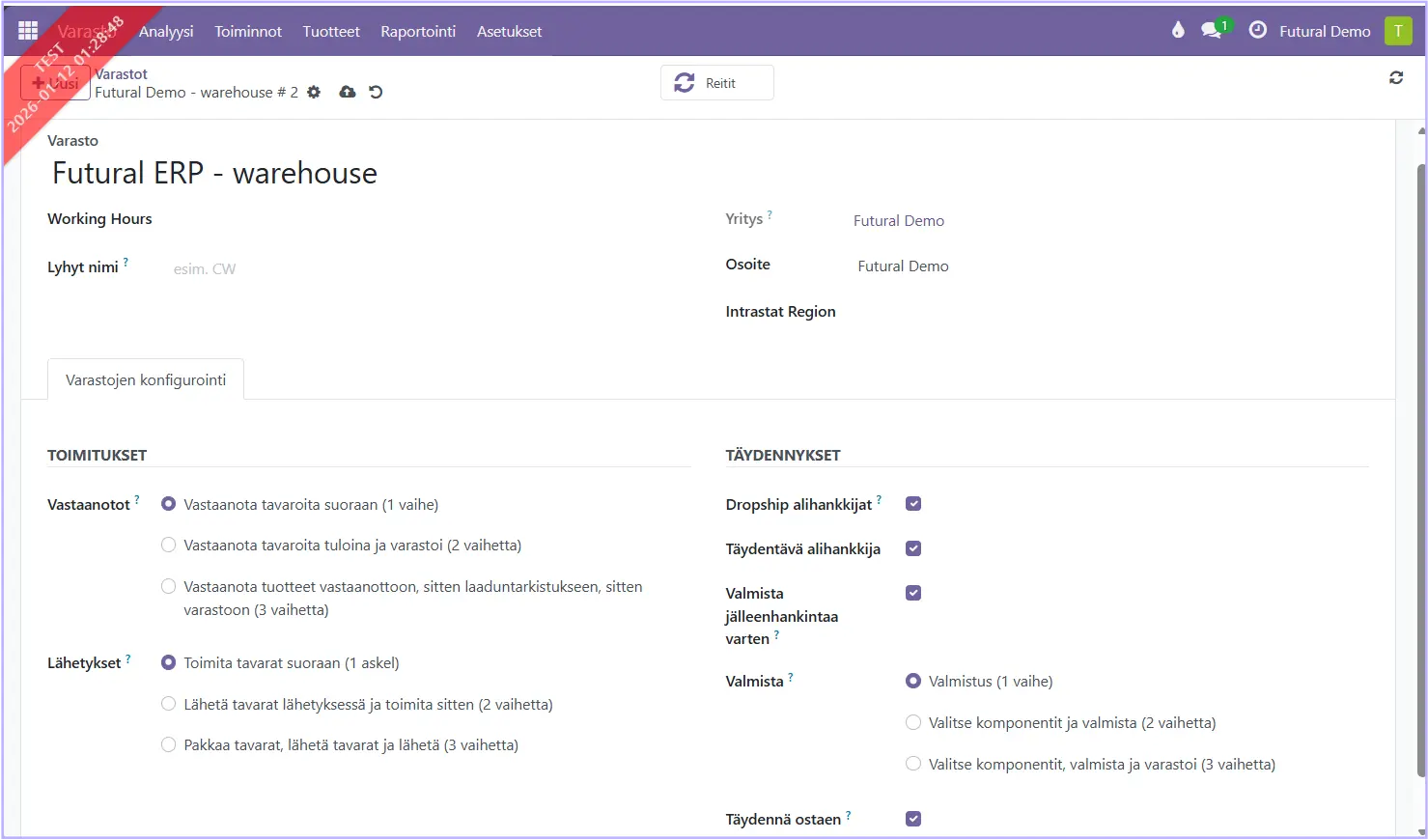 Muuta tarvittaessa Toimitukset ja Täydennykset kohtien tietoja. (Poista esimerkiksi täpät kohdista Täydennä ostaen, jos varasto on asiakkaan kaupintavarasto, eikä sinne voi merkitä ostotilauksia, ja Manufacture to Resupply, jos valmistusta ei tarvita)