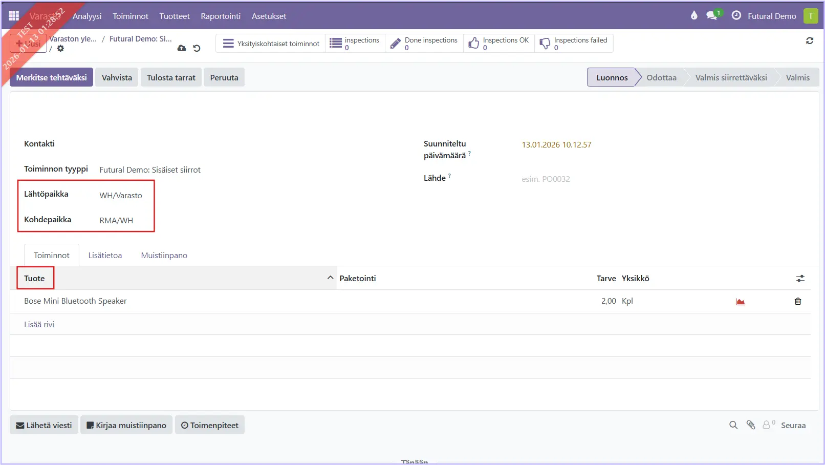 Valitse (jomman kumman) varaston Sisäiset siirrot laatikko ja paina avautuvassa näkymässä Luo.