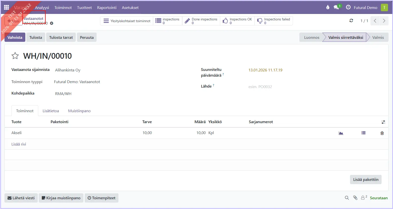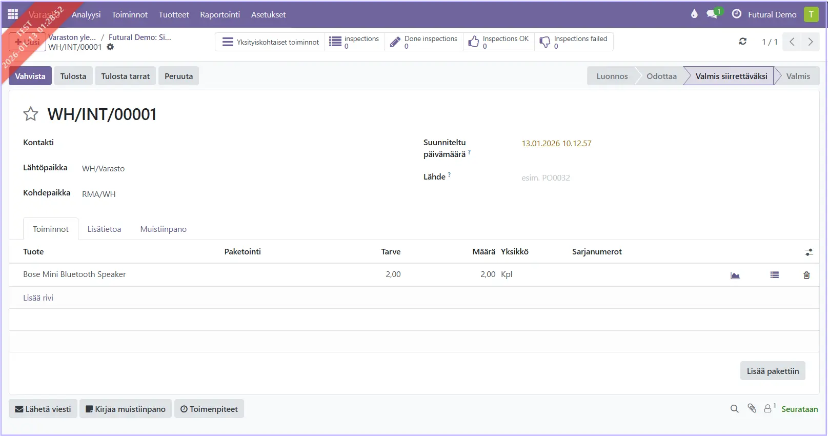 Vahvista siirto, jolloin tuotteet kirjautuvat haluamaasi varastoon. Sisäinen siirto toimii samalla logiikalla kuin muutkin siirtotilaukset.