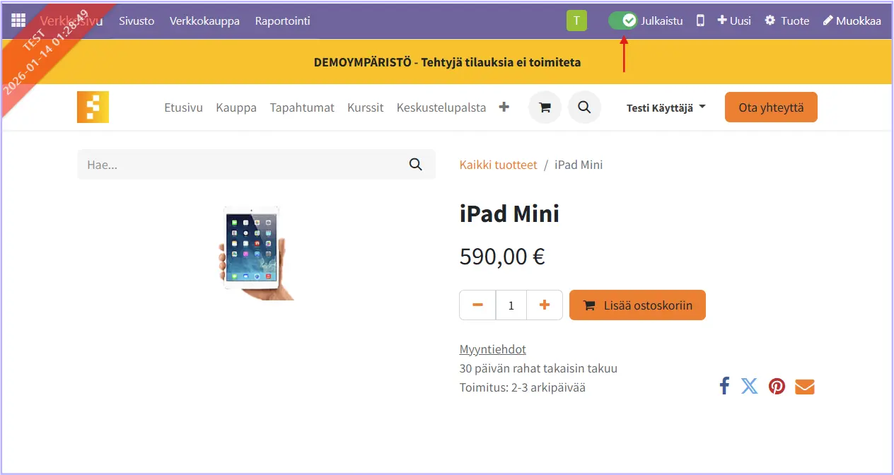 Voit julkaista tuotteita verkkokauppaan tuotteen verkkosivunäkymässä.