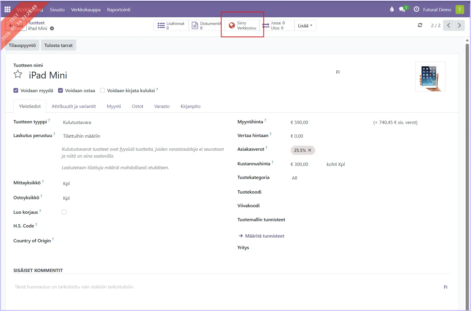 Avaa haluamasi tuote tuotevalikosta. Yläosan maapallo-kuvake on punainen, joten tuotetta ei ole julkaistu. Vihreä maapallo kertoo, että tuote on julkaistu. Klikkaamalla kuvaketta siirryt verkkosivulle.