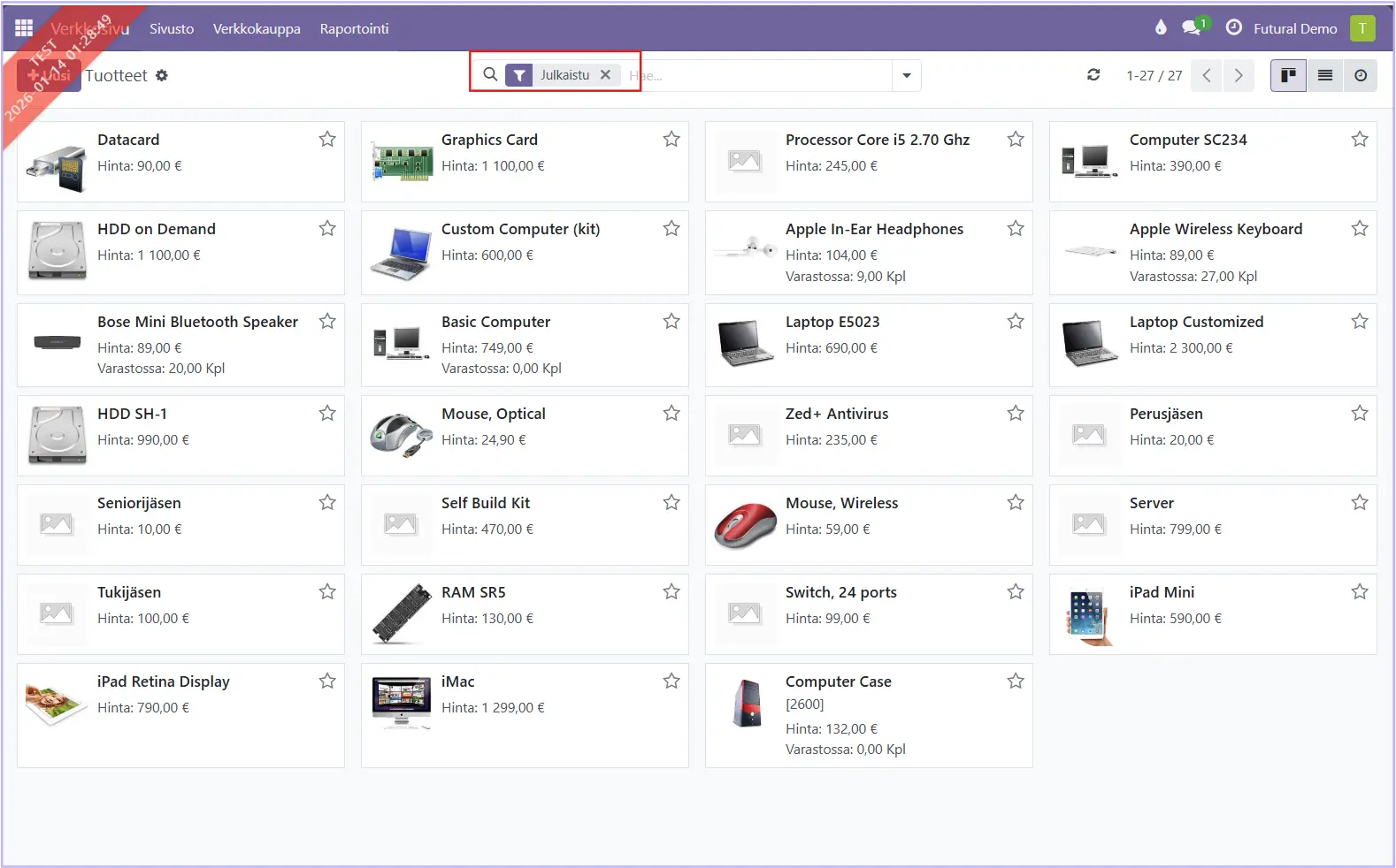 Tässä on automaattisesti suodattimeksi asetettu Julkaistu. Poistamalla suotimen saat näkyville kaikki järjestelmään luodut tuotteet. Voit myös vaihtaa suotimeksi Julkaisematon (Is published = False), jolloin saat näkymään vain julkaisemattomat tuotteet.