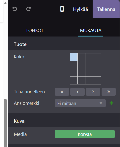 Valitse tuote, jonka haluat tuoda esiin. Klikkaa aktiiviseksi tuotelaatikko, jota haluat muokata. Oikeaan reunaan tulee esiin ruudukko ja nuolia.