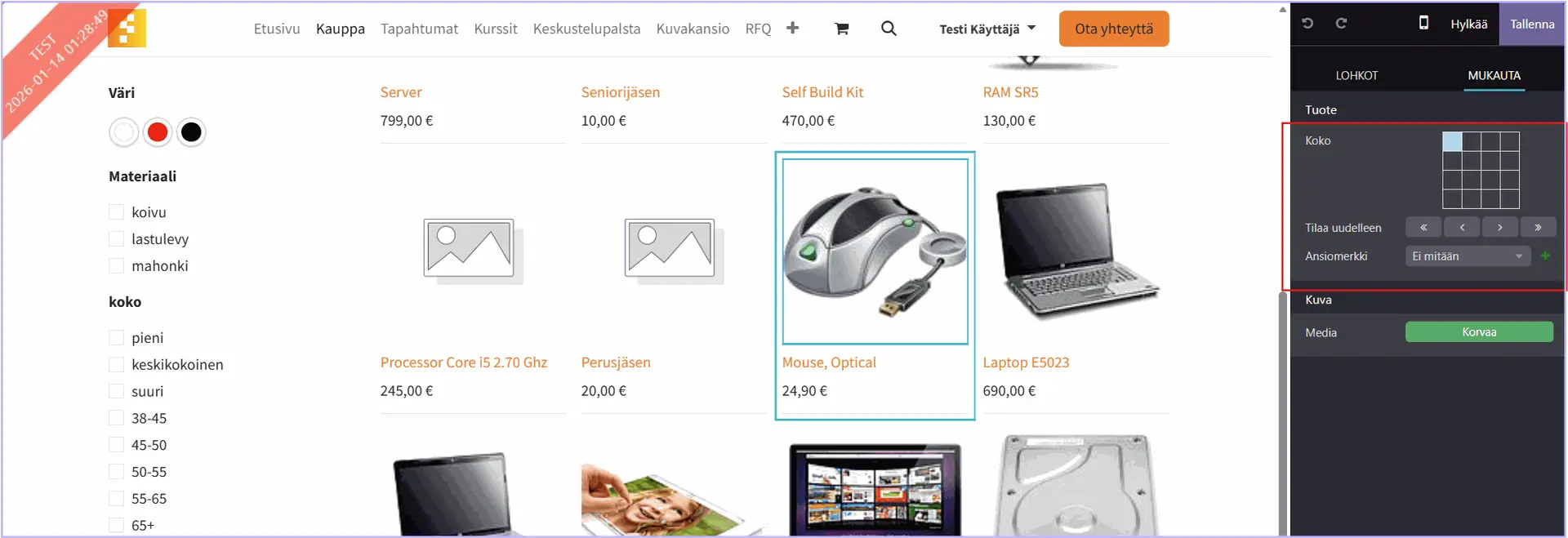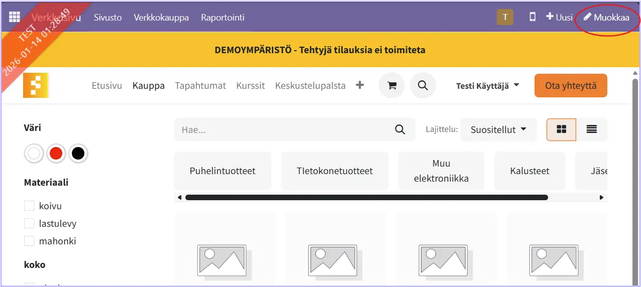Tämä tehdään muokkaamalla tuotesivua verkkosivu-editorissa.