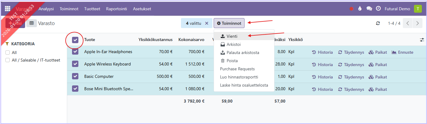 Voit valita kaikki rivit, ratas-kuvakkeen toiminnot ja Vienti, näin saat tuotelistauksen helposti Exceliin.