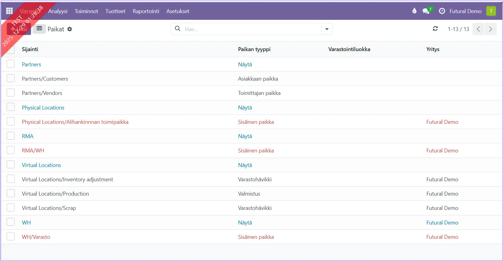 - Partner Locations/Customers: Kun tuote toimitetaan myyntitilauksen seurauksena asiakkaalle, syntyy varastosiirto yrityksen varastopaikalta asiakkaan varastopaikalle.