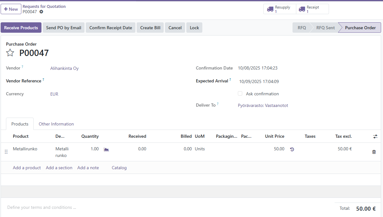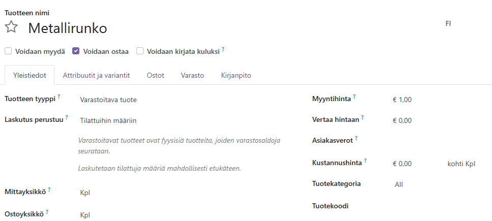 - Lisää riville Tuote: alihankintatuote (Metallirunko)