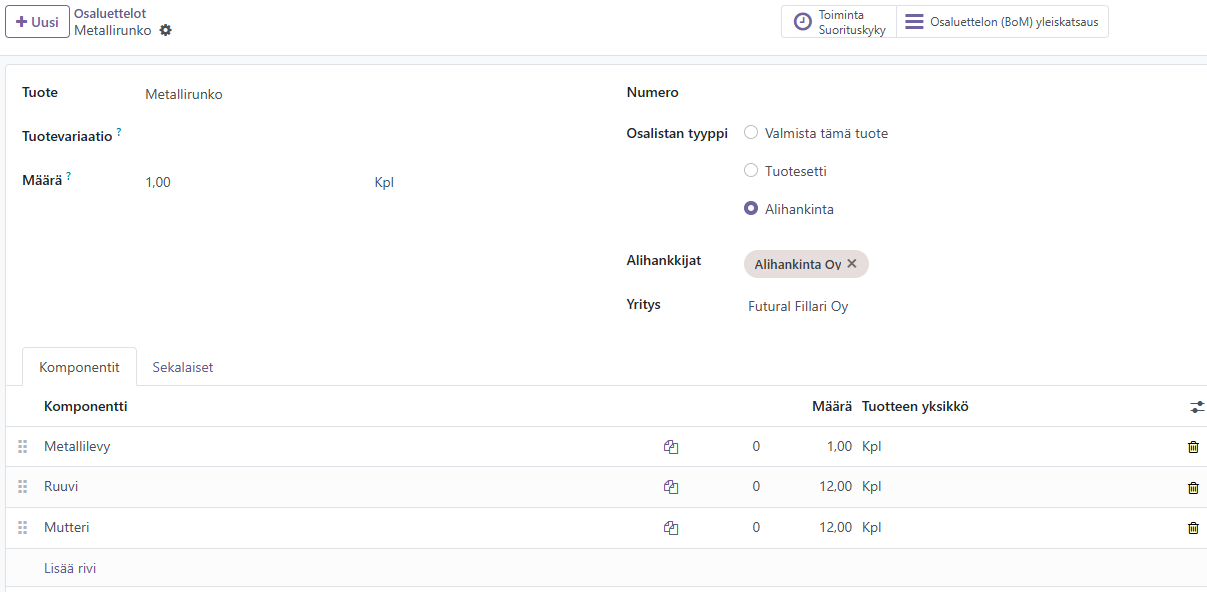 - Tuote: valitse aiemmin luotu alihankintatuote (Metallirunko)