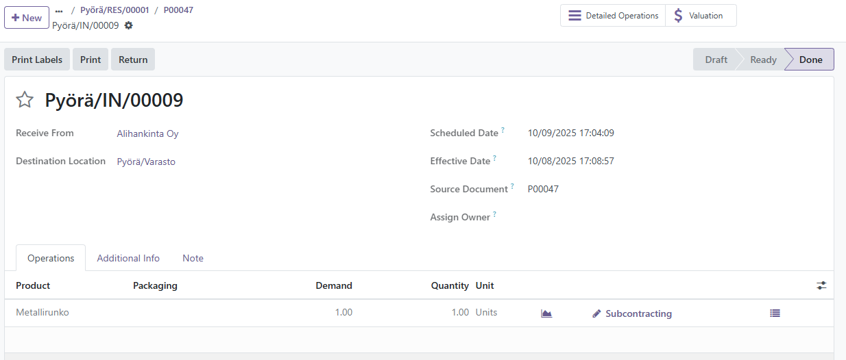 Odoo luo nyt automaattisesti vastaanoton JA varastosiirron (resupply), jolla toimitetaan raaka-aineet alihankkijalle.