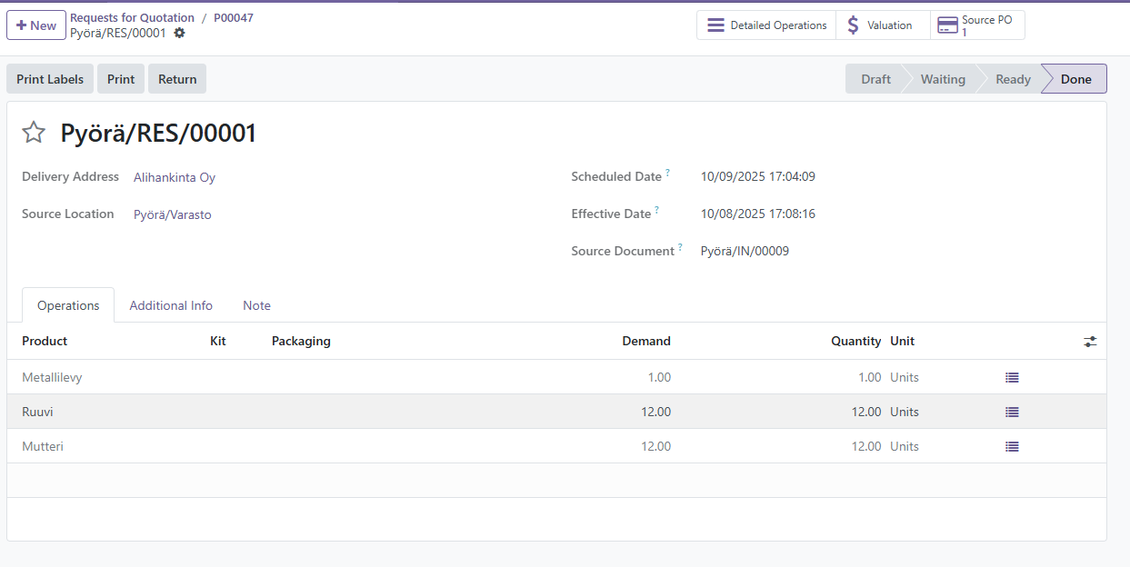 💡 Käyttöetu: Odoo hoitaa raaka-aineiden toimitusprosessin automaattisesti, kun ostat lopputuotteen alihankkijalta.