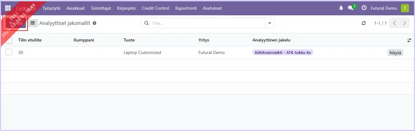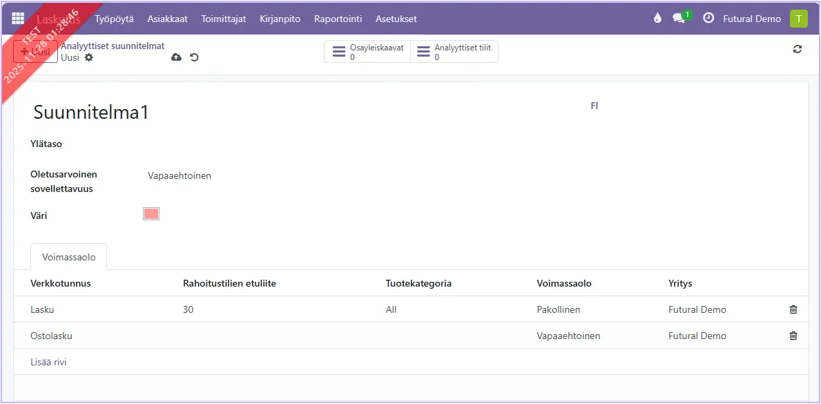 Valitse kohta Analyyttiset suunnitelmat ja vasemmasta yläreunasta +Uusi. Näin määritellään ne elementit, joissa kustannuspaikkoja käytetään (esim. myyntitilaus, lasku, ostotilaus, ostolasku, ym.).