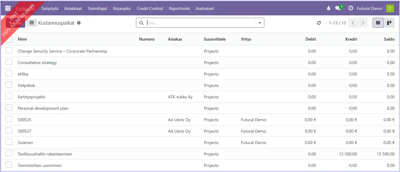 HUOM! Jos käytössä on taloushallinto-integraatio, kustannuspaikat haetaan yleensä automaattisesti. Tällöin ei saa tehdä niihin muutoksia tai lisäyksiä Futuralissa.