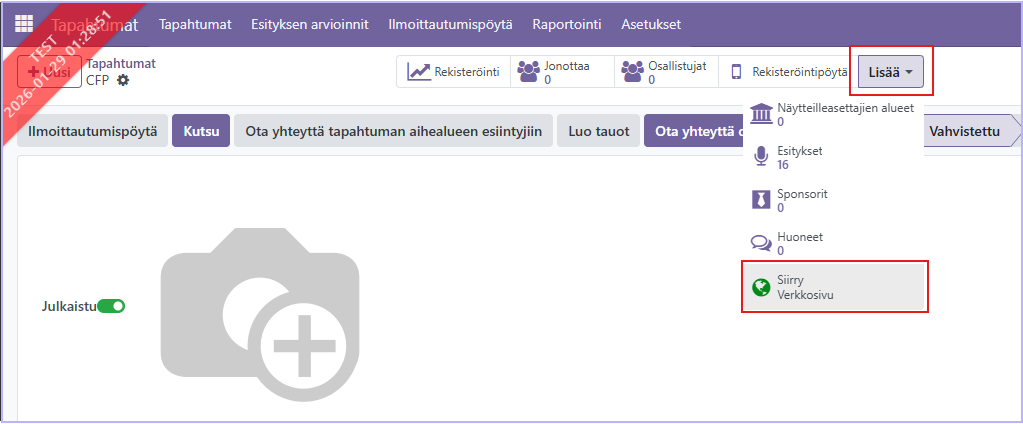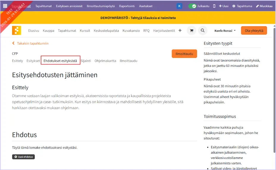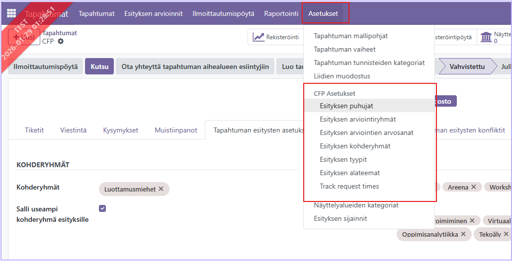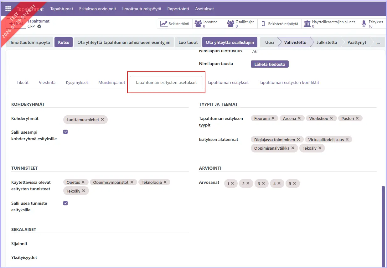 Asetukset kerättäville esitysehdotuksille tehdään tapahtuman välilehdellä: Tapahtuman esitysten asetukset.