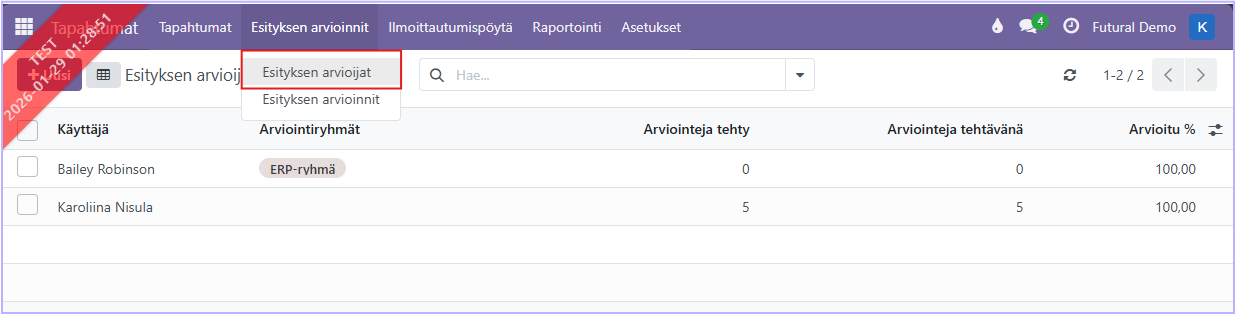 Esitysten arvioijat määritellään kohdassa ”Esityksen arvioijat”. Voit luoda uusia arvioijia valitsemalla järjestelmän käyttäjistä sopivia henkilöitä. Voit luoda arviointiryhmiä ja kiinnittää arvioijat niihin kohdassa Esityksen arvioinnit.