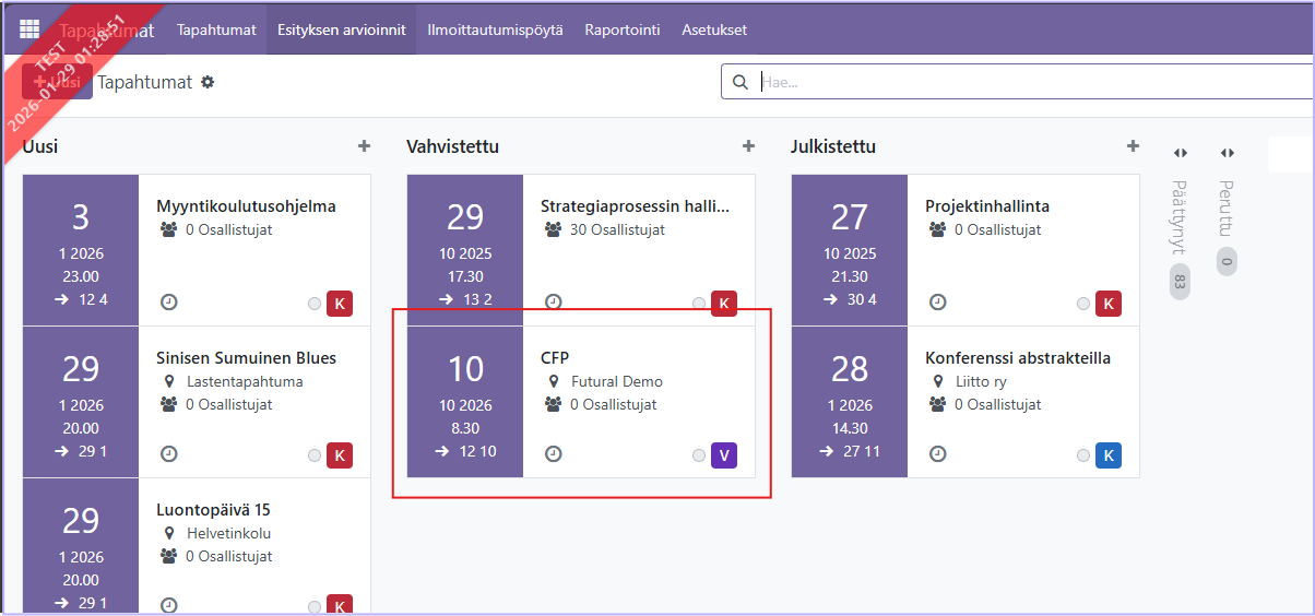 Valitse demoympäristöstä tapahtuma CFP, jossa pääset tarkastelemaan esitysten hallintaa. Avaa tapahtuman tiedot klikkaamalla sen korttia.