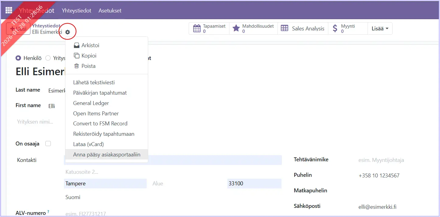 Yksinkertaisin tapa luoda uusi käyttäjä on mennä kyseisen kontaktin kontaktitietoon kohdassa Yhteystiedot. Klikkaa vasemmassa yläreunassa hammasratas-kuvaketta ja valitse "anna pääsy asiakasportaaliin".