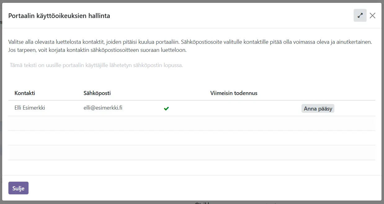 Klikkaa nappia "Anna pääsy". Järjestelmä lähettää käyttäjän sähköpostiin kutsuviestin, jolla hän voi luoda itselleen salasanan. (Huom! Järjestelmän sähköpostiasetusten pitää olla sellaiset, että järjestelmästä lähtee sähköposteja ulos. Esim. testijärjestelmissä uloslähtevä sähköpostiliikenne on turvallisuussyistä estetty ja siksi et pysty testaamaan viestin lähetystä testiympäristössä.)
