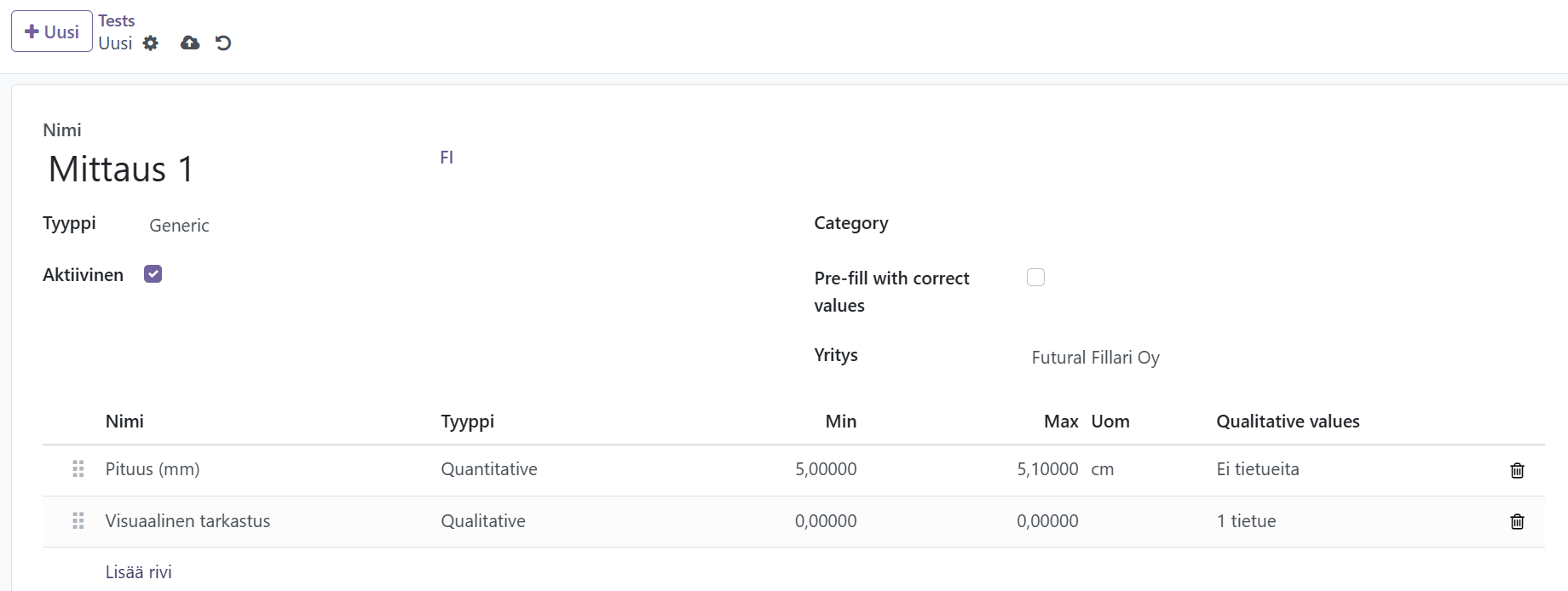 - Varmista, että testit ja kysymykset on määritelty hyvin: selkeät min/max-parametrit, arvojen yksiköt.
