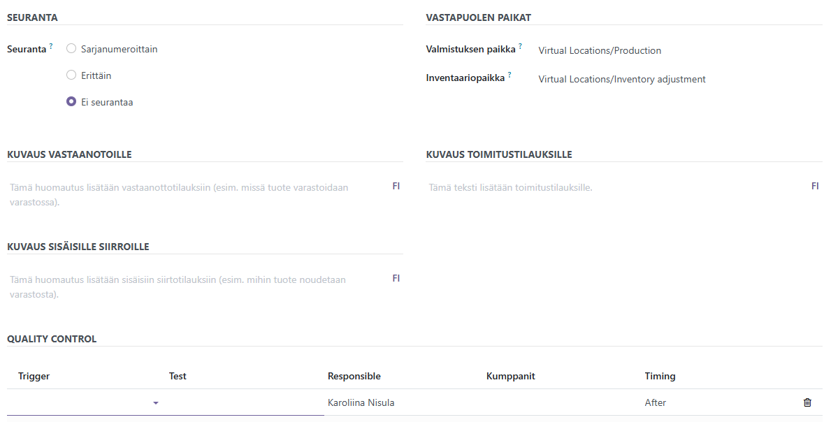 - Kun prosessi (esim. varastosiirto tai valmistus) tapahtuu, tarkastus/inspektio luodaan automaattisesti triggerin perusteella.