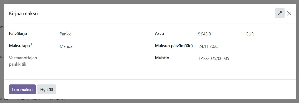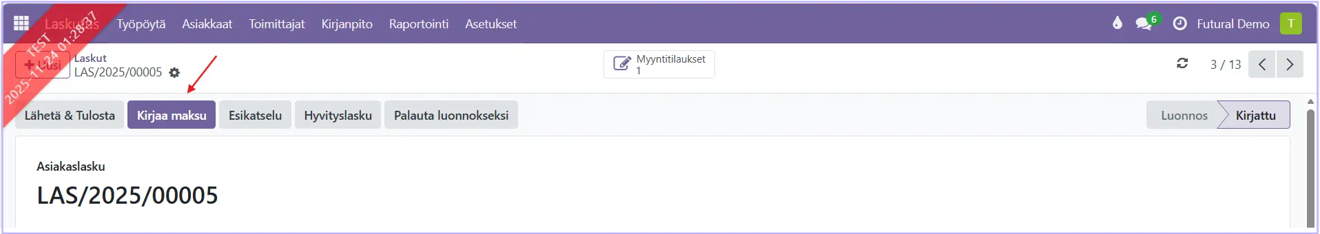 Voit kirjata laskun maksetuksi avaamalla laskun ja painamalla Kirjaa maksu.