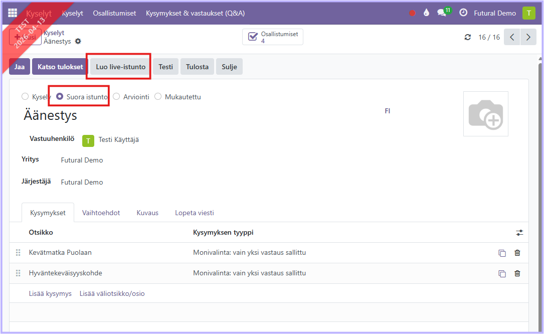 Suora istunto on reaaliaikainen kyselytyyppi, jossa osallistujat antavat vastauksensa reaaliaikaisesti istunnon aikana, jolloin tulokset ovat välittömästi nähtävissä kaikille.